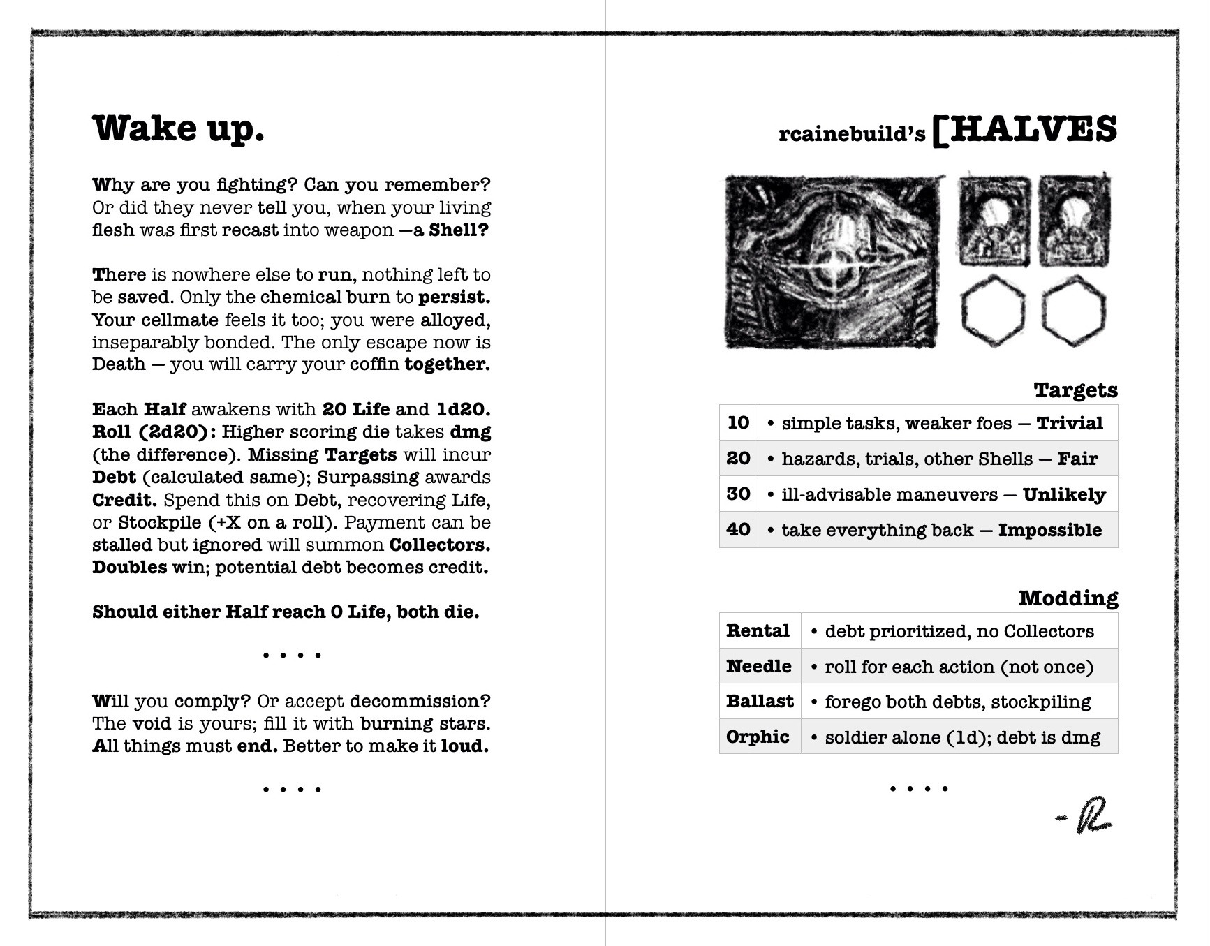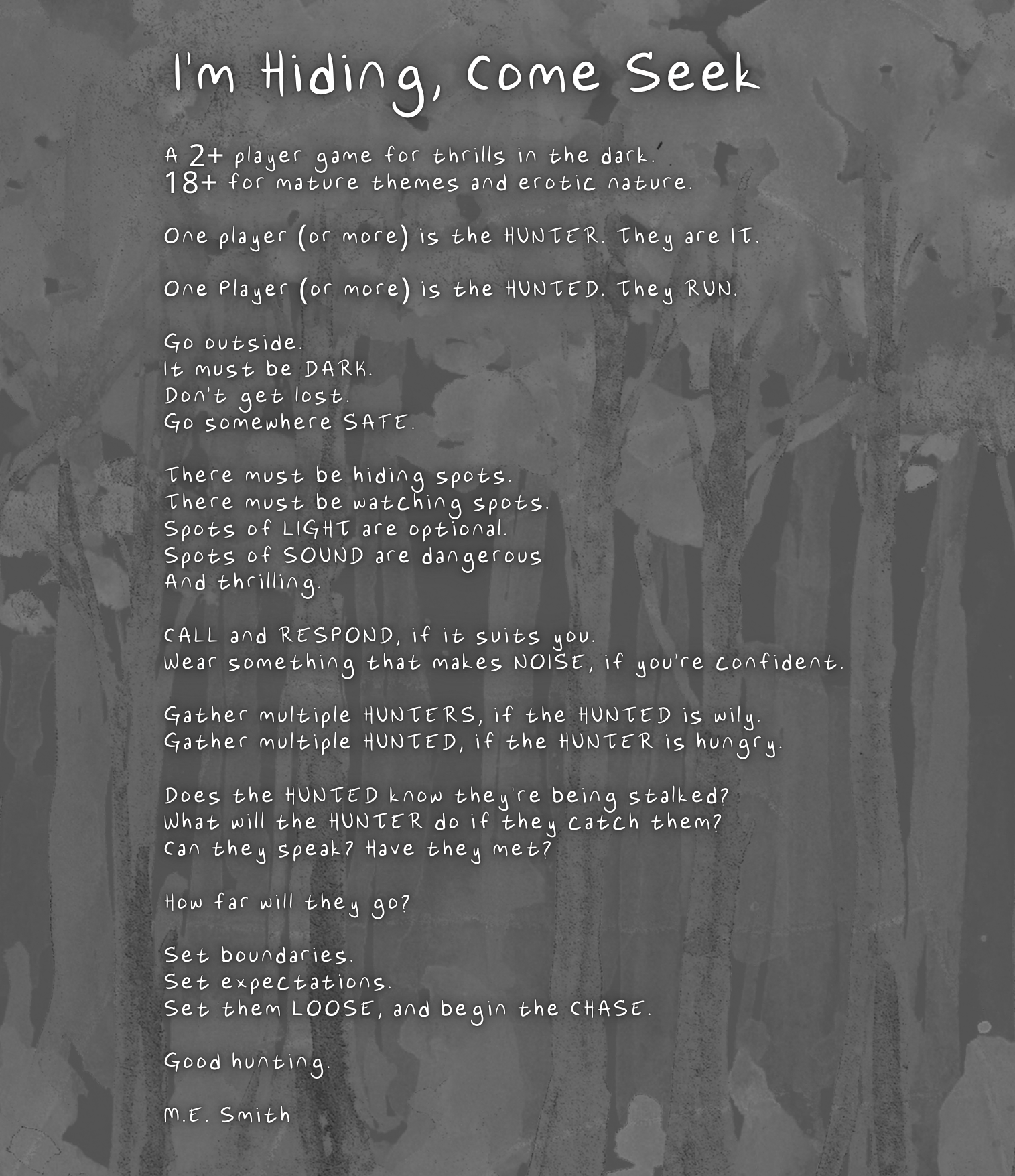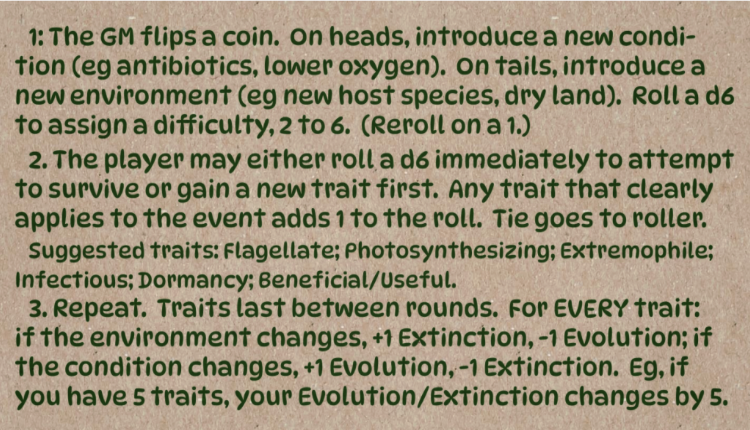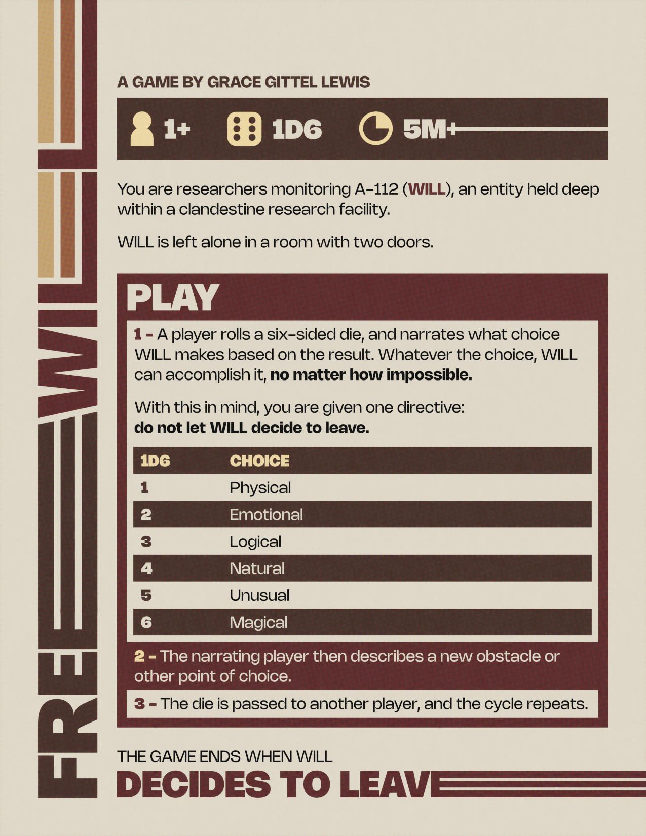 Permission is hereby granted to reproduce and create derivative works of all rule text so long as all reproductions and works include or are accompanied by the following instructions: "This is a game based on Sting's 1993 "Shape of My Heart." To understand the game, read the rules while playing the song or interleave the rules text with the lyrics as appropriate."